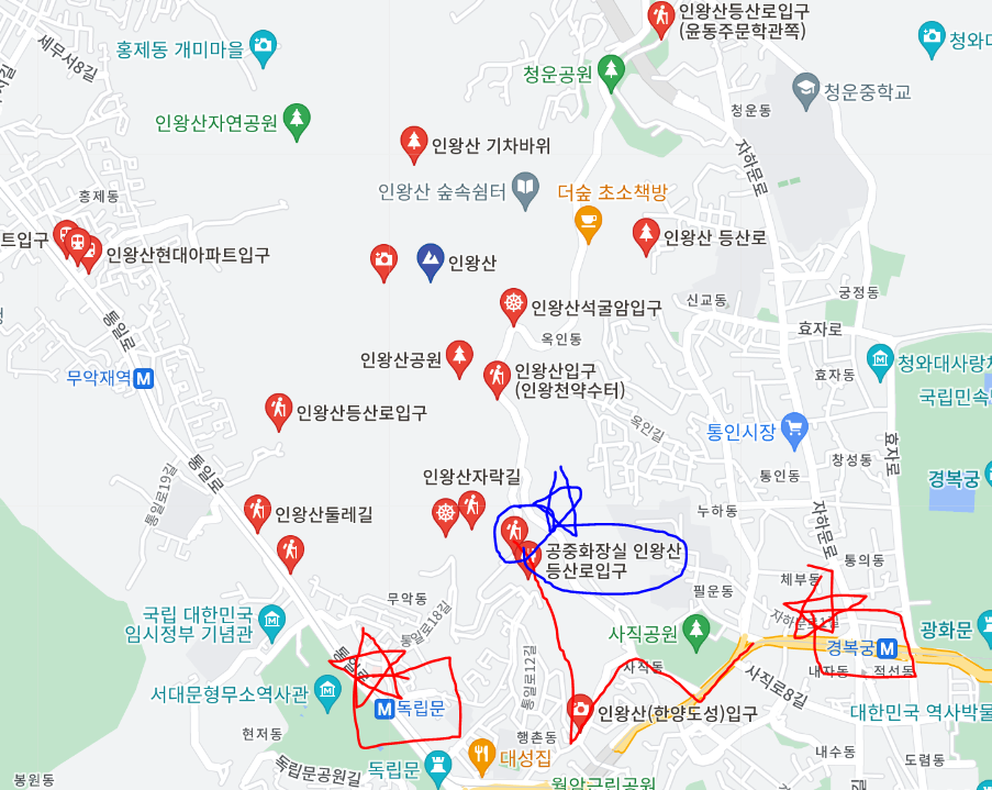 캡처한 지도를 보면 인왕산 등산로 입구는 여러 군데에 있어서 본인의 출발지에서 가장 가까운 입구로 올라가도 된다.